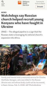 USA infoagentuur Religion News Service teatab viidates inimõiguslaste organisatsioonile Vocal Africa: Vene õigeusukiriku Aafrika eksarhaat kutsub noori Keenia mehi Venemaale tööle või õppima, võttes enda peale kohustuse rahastada keenialaste sõitu Venemaale. Vocal Africa operatiivse reageerimise osakonna juht Frederick Odhiambo Ojiro teatab: „Nad räägivad noortele, et kirik annab nüüd noortele inimestele sellised võimalused Venemaal. Nad kasutavad ära naisi, ei luua lähemaid kontakte, kuna naised on rahulikud ja tekitavad rohkem usaldust.“