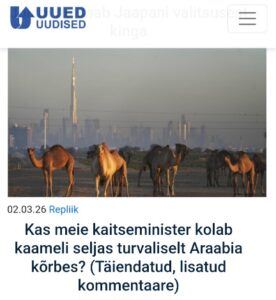 EKRE organile Uued Uudised teeb kohutavalt nalja see, et meie kaitseminister Hanno Pevkur jäi Dubais sõjale jalgu ja suundus maapealse sõidukiga Omaani. Ekrelaste kahjurõõm on nii suur, et nad eristavad aina uusi vaimukusi. Kuid nende fantaasia on zooloogilist laadi – et Eesti kaitseminister rändavat kaameli seljas.