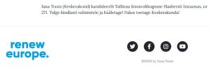 Loomulikult ajas see märkus Jana Toomi tagajalgadele: kuidas siis nii, tema ise ju teeb valimisreklaami sisuliselt europarlamendi autoriteeti kasutades – näiteks kõik, kes tahtsid 04. septembril kuulata eurouudiseid MEP Toomi saidil logoga „renew europe.“ avaldatud saatest, kuulsid tema suust: „tere. Siin oleks pidanud olema „Brüsseli päevik Jana Toomiga“, aga kuna meil on lähenemas meeletu kiirusega kohalikud valimised, siis ausalt öeldes tahaks vastata küsimustele…“ jne jms. Saate all „renew europe.“ logo kõrval tekst: „Jana Toom (Keskerakond) kandideerib Tallinna linnavolikogusse Haabersti linnaosas, nr 271. Tulge kindlasti valimistele ja hääletage! Palun toetage Keskerakonda!“